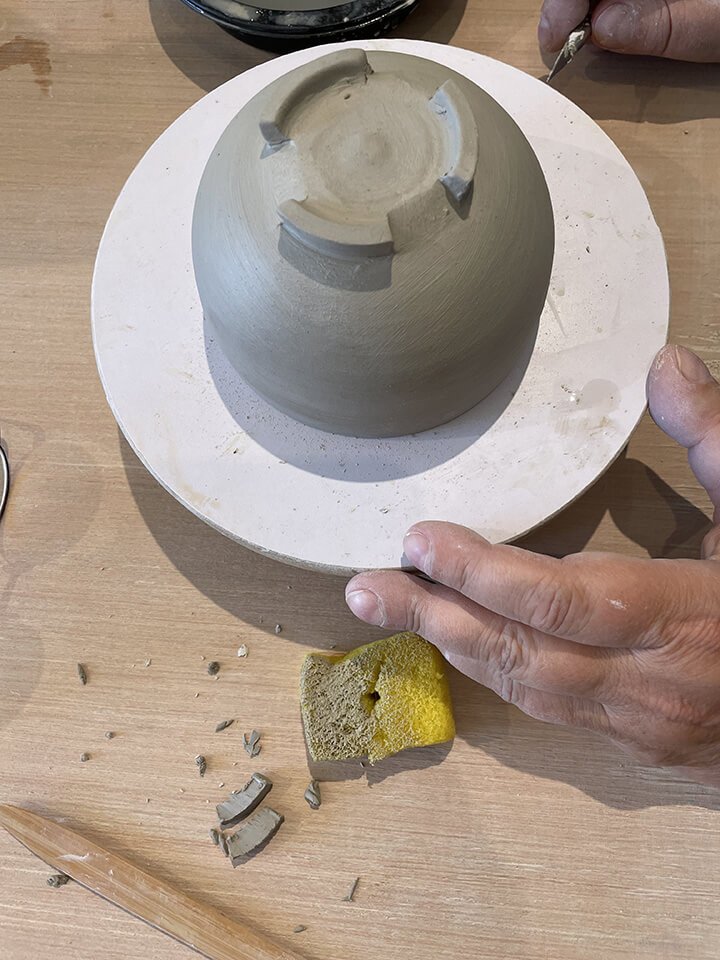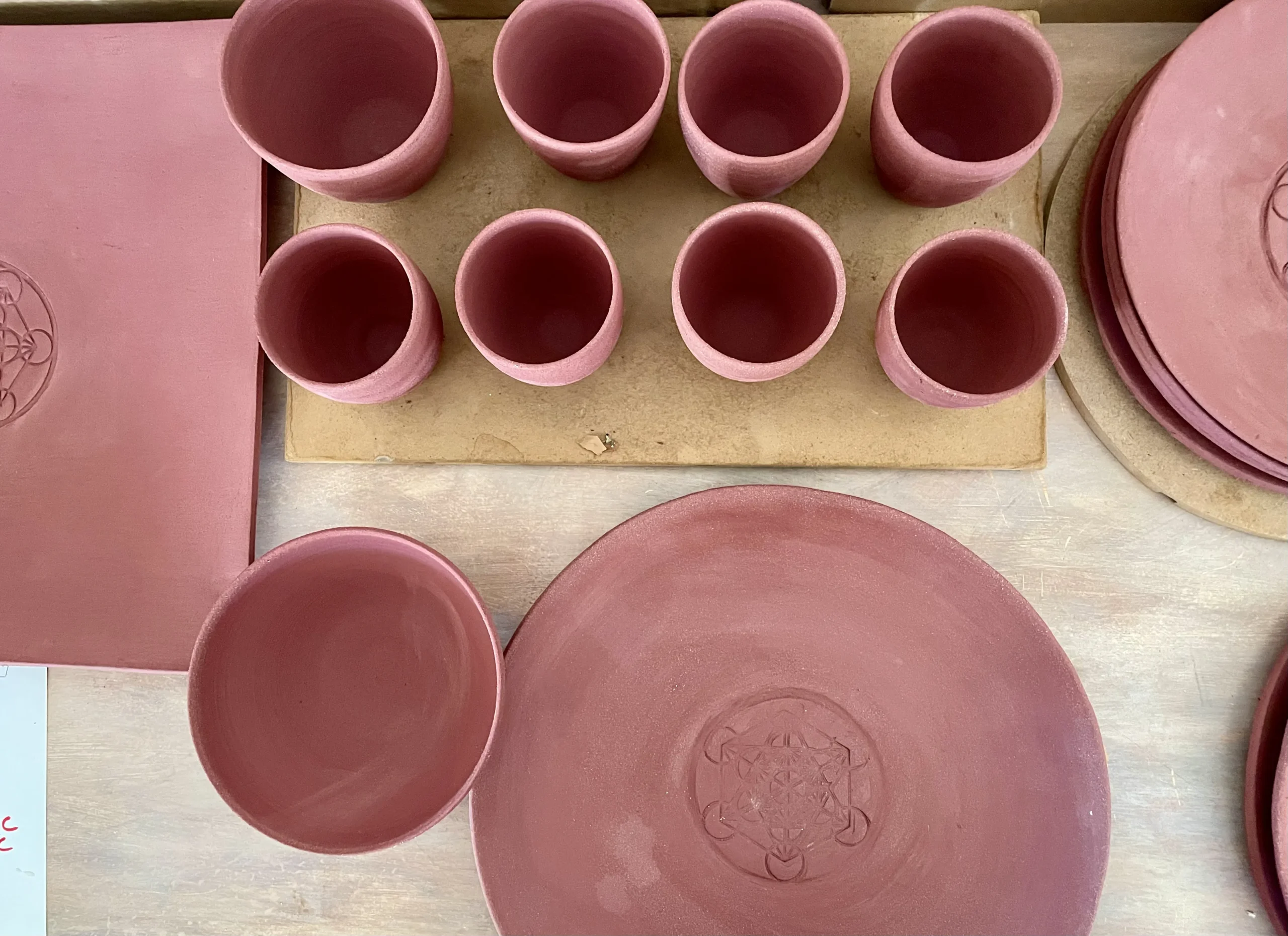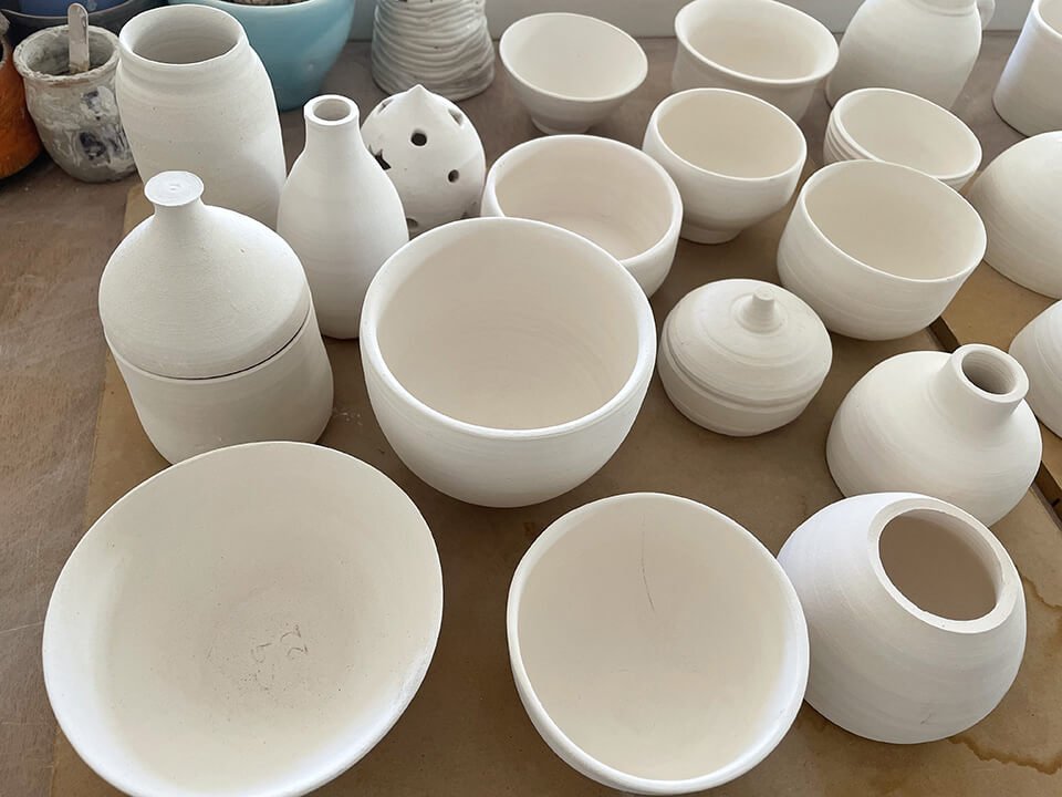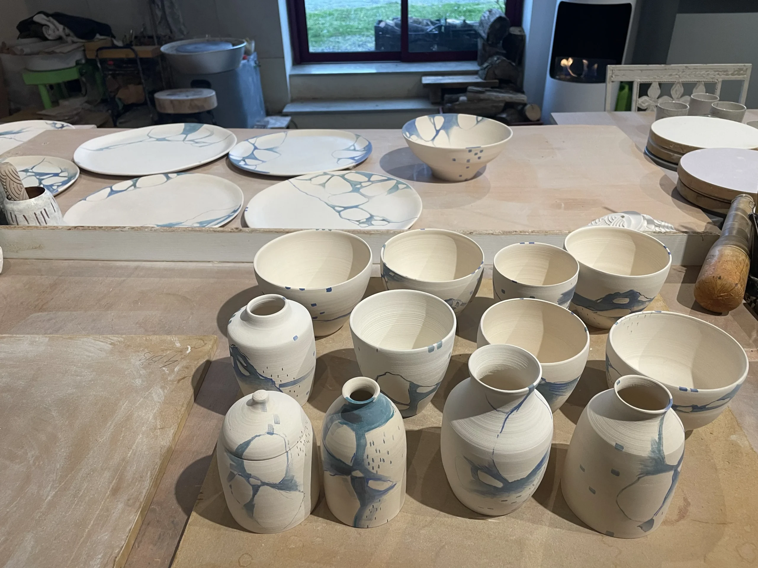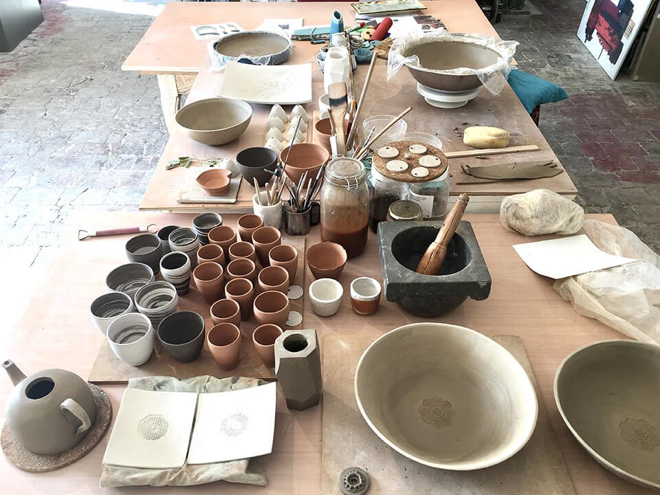 Les pièces réalisées durant le stage sont préparées, séchées et cuites selon les étapes nécessaires au processus céramique : cuisson du biscuit, ansage et décor en sgraffitage ou à l’engobe.
